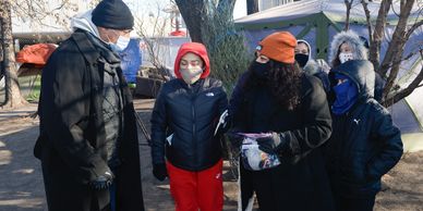 Despite freezing temperatures, members from New Faith Missionary Baptist Church brought hot meals to the homeless in what is known as Tent City at 12th street off the Dan Ryan Expressway. Rev. Jesse L. Jackson, Sr. urged that the City do more to end homelessness. Photo by John L. Alexander